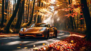 Een luxueuze amber kleurige sportwagen navigeert een bochtige bosweg, omringd door een betoverend herfstlandschap. Gouden zonnestralen doorbreken het bladerdak en creëren een magische sfeer. De LED-koplampen en zwarte velgen contrasteren perfect met de vurige herfstkleuren, terwijl gevallen esdoornbladeren in geel, oranje en rood de weg sieren.
