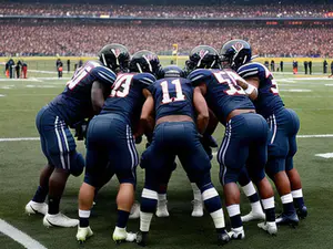 Krachtig beeld van een American football team in overleg op het veld tijdens een belangrijke wedstrijd. De spelers, gekleed in donkerblauwe uniformen, vormen een hechte huddle terwijl een vol stadion op de achtergrond toekijkt. perfect voor artikelen over teamwork, sportverslaggeving of Amerikaanse sporten.