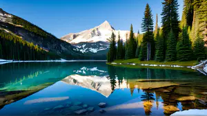 Adembenemend natuurtafereel van een kristalhelder bergmeer waarin besneeuwde bergtoppen perfect weerspiegelen. Het turquoise water vormt een magisch contrast met de groene dennenbossen en witte bergtoppen. De verstilde sfeer en zuivere reflectie maken deze locatie tot een paradijs voor natuurliefhebbers en landschapsfotografen.