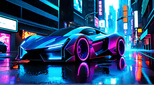 Een futuristische superauto met blauw-paarse metaalkleur en opvallende roze neon wielverlichting glimt op het regenachtige asfalt. De auto wordt omringd door levendige neonreclames die kleurrijk reflecteren op het natte wegdek in deze drukke cyberpunk metropool.
