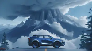 Een moderne blauwe elektrische SUV rijdt over een bergweg die door wolken omringd wordt. Op de achtergrond rijst een indrukwekkende scherpe bergtop op, gedeeltelijk gehuld in wolken, met sneeuw op de toppen. De dramatische wolkenformaties en naaldbomen langs de weg creëren een surrealistisch berglandschap met een mysterieuze sfeer.