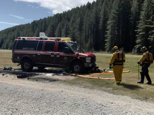 Brandweerlieden bij uitgebrande hulpdienstvoertuig in bosgebied AI-gegenereerd