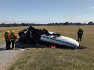 Professionele hulpverleners in beschermende kleding inspecteren een uitgebrand vliegtuigwrak op een afgelegen landingsterrein. De dramatische foto toont de nasleep van een incident waarbij het vliegtuig zwaar beschadigd raakte. Het contrast tussen de blauwe lucht en het zwartgeblakerde wrak creëert een indringende sfeer.