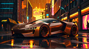 Een elegante superauto met bronzen metalen afwerking glimt in het regenachtige nachtleven van een cyberpunk metropool. Neonreclames en gouden zonsondergangskleuren reflecteren op het natte wegdek, terwijl regendruppels de dramatische stedelijke scène verlevendigen.