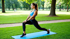 Dynamische workout in de frisse buitenlucht van een groen stadspark. De blauwe yogamat op het gras biedt een perfect oppervlak voor verschillende fitnessoefeningen. De sportieve outfit in blauw en zwart past perfect bij de actieve buitentraining. Een inspirerend beeld voor gezond bewegen in de natuur.