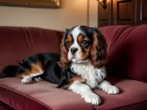 Elegante Cavalier King Charles Spaniel in driekleur ligt ontspannen op een comfortabele bordeauxrode bank. De karakteristieke lange oren en expressieve ogen van het ras komen prachtig uit tegen de warme achtergrond, wat deze foto perfect maakt voor huisdier- en interieurliefhebbers.