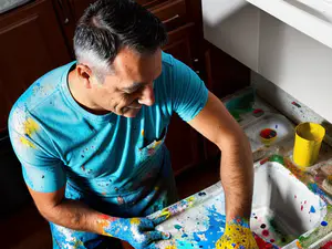 Expressieve momentopname van een kunstenaar in een turquoise shirt, bedekt met levendige verfspetters tijdens het creatieve proces. De authentieke werksfeer straalt door in deze dynamische studiofoto, waar passie voor kunst en spontaniteit samenkomen in een kleurrijk tafereel.