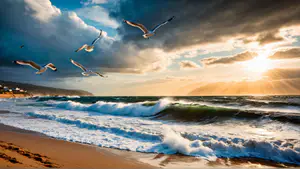 Adembenemend zeegezicht tijdens zonsondergang met krachtige golven die op het strand rollen. Tegen een dramatische hemel met gouden zonnestralen zweven elegante meeuwen boven de woeste branding. De combinatie van turquoise water, gouden licht en dynamische wolkenformaties creëert een spectaculair natuurtafereel dat perfect is voor wanddecoratie ...