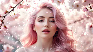 Sfeervolle voorjaarsfotografie met zachte roze tinten en dwarrelende kersenbloesems. Het beeld straalt een dromerige, romantische sfeer uit tegen een achtergrond van bloeiende sakura takken. De zachte belichting en vallende bloemblaadjes creëren een betoverende lentesfeer die perfect is voor lifestyle en beauty content.