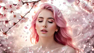 Sfeervolle voorjaarsfotografie met zachte pasteltinten en vallende kersenbloesem. De compositie straalt een dromerige lentesfeer uit met subtiele lichtval en romantische details. perfect voor beauty campagnes, lifestyle content of voorjaarsadvertenties met een elegante, natuurlijke uitstraling.