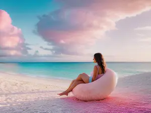 Sereen tafereel van een tropisch strand tijdens een betoverende zonsondergang. De turquoise zee en roze wolken creëren een dromerige sfeer, terwijl een moderne roze loungestoel op het witte zand staat. perfect voor reisbrochures, vakantieadvertenties of lifestyle content die rust en luxe uitstraalt.