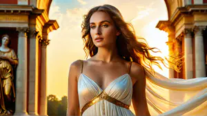 Stijlvolle modelfotografie in Griekse stijl tegen een achtergrond van klassieke architectuur tijdens het gouden uur. De witte jurk met gouden accenten wordt prachtig belicht door de warme zonsondergang, terwijl klassieke zuilen en beelden het tijdloze karakter van de compositie versterken. perfect voor mode, bruidsfotografie of luxe advertenties.