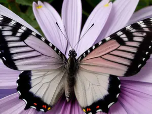 Indrukwekkende macrofoto van een zwart-witte vlinder rustend op een paarse bloem. De gedetailleerde vleugeltekening met zwarte randen en witte binnenvlakken contrasteert prachtig met de lichtpaarse bloemblaadjes. perfect voor natuurmagazines, tuinblogs of educatief materiaal over vlinders en biodiversiteit.