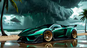 Een schitterende emerald groene hypercar met opvallende gouden velgen poseert majestueus op een regenachtig tropisch strand. De agressieve aerodynamische lijnen en scherpe hoeken van het voertuig vormen een fascinerend contrast met de organische schoonheid van de omringende palmbomen. Zware stormwolken domineren de lucht terwijl regendruppels de glanzende carrosserie bedekken. Het natte zand reflecteert perfect de onderkant van deze exclusieve bolide, wat het dramatische beeld van technologisch