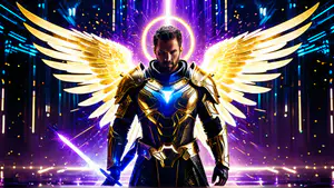Indrukwekkende digitale illustratie van een mystieke krijger in glanzend gouden gevechtsharnas met stralende vleugels. Het beeld wordt gedomineerd door neonblauwe en paarse kleuren, met een magisch zwaard en een heilige nimbus. perfect voor fantasy gaming projecten, boekomslagen of epische posters.