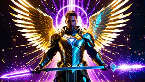 Indrukwekkende digitale fantasie-illustratie van een krijger in glanzend gouden harnas met majestueuze vleugels. Het beeld straalt macht uit door de combinatie van een lichtgevend magisch zwaard, paarse energiestralen en een stralende nimbus. perfect voor fantasy games, boekomslagen of epische kunstprojecten.