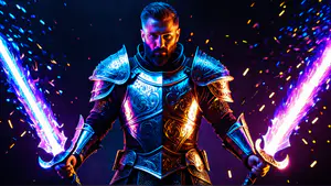 Indrukwekkende fantasy illustratie van een geharnaste krijger in een mystiek tweedelig harnas, verlicht door neon blauw en oranje. De warrior draagt versierd pantser en zwaait met twee magische zwaarden die een bovennatuurlijke gloed uitstralen. perfect voor gaming artwork of fantasy concepten.