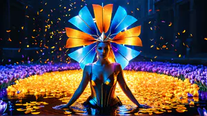 Betoverend kunstzinnig portret in een veld van gouden en paarse tulpen. De dramatische compositie wordt versterkt door een opvallende hoofdtooi in blauw en oranje tinten, die als een stralenkrans om het hoofd schittert. Het wateroppervlak en de dwarrelende confetti creëren een magische sfeer in het nachtelijke tafereel.