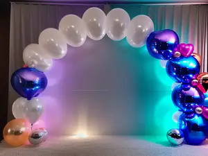 Stijlvolle ballonnenboog met een mix van witte en metallic blauwe ballonnen, sfeervol uitgelicht door paarse en turquoise LED-spots. perfect als achtergrond voor fotomomenten tijdens bruiloften, bedrijfsfeesten of andere speciale gelegenheden. De professionele opstelling combineert moderne verlichting met klassieke ballondecoratie.