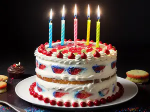 Prachtige twee-laags verjaardagstaart met verse slagroom en aardbeien decoratie. De taart heeft een speels rood-wit-blauw kleurpatroon en is versierd met brandende kaarsjes in verschillende kleuren. Rond de basis loopt een elegante rode parelrand. perfect als stijlvolle centerpiece voor elk verjaardagsfeest.