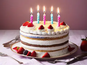 Prachtige gelaagde verjaardagstaart versierd met verse aardbeien en slagroom. De taart heeft verschillende luchtige lagen, afgewisseld met romige vulling. Bovenop prijken vijf brandende kaarsjes in roze en blauw, omringd door vers fruit. perfect voor een feestelijke gelegenheid of speciale verjaardag.