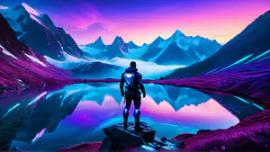 Adembenemend surrealistisch berglandschap in levendige neon tinten van paars en blauw. Een mysterieuze figuur in futuristische uitrusting staat bij een spiegelend bergmeer, omringd door majestueuze besneeuwde bergtoppen. De dramatische zonsondergang creëert een betoverende cyberpunk sfeer die realiteit en fantasie vermengt.