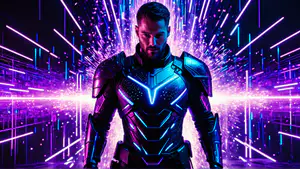 Spectaculaire digitale kunst van een futuristisch harnas met gloeiende neonlijnen in paars en blauw. Het ontwerp straalt kracht en technologie uit tegen een achtergrond van lichteffecten en vonken. perfect voor gaming concepten, sciencefiction projecten of moderne tech-marketing materialen.