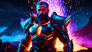 Spectaculaire digitale illustratie van een imposante krijger in een hightech gevechtsharnas met gloeiende neondetails. Het futuristische pantser combineert blauw metaal met oranje energielijnen tegen een dramatische achtergrond van paarse en blauwe explosies. perfect voor gaming artwork of moderne fantasy concepten.