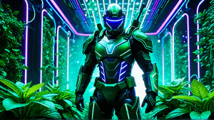 Imposante compositie van een high-tech gevechtsharnas in een mysterieuze neon jungle. De combinatie van heldergroene en paarse neonverlichting creëert een meeslepende cyberpunk sfeer. Het futuristische pantser met gloeiende accenten wordt omringd door weelderige vegetatie, wat zorgt voor een fascinerend contrast tussen natuur en technologie.
