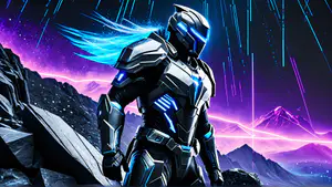 Futuristisch gevechtsharnas in neonverlicht berglandschap met aurora AI-gegenereerd