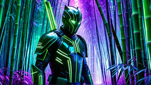 Spectaculaire digitale kunstwerk van een futuristische krijger in glanzend zwart pantser met neongroene accenten, staand in een mysterieus bamboebos. De achtergrond wordt gedomineerd door levendige paarse en turquoise lichteffecten die een magische sfeer creëren. perfect voor gaming-gerelateerde projecten of moderne wanddecoratie.