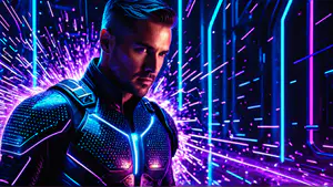 Spectaculaire studiofoto met futuristische uitstraling, gekenmerkt door intense neonblauwe en paarse lichteffecten. Het beeld toont een hightech kostuum met lichtgevende details tegen een dynamische achtergrond vol energieke lichtstralen. perfect voor gaming, entertainment of moderne marketingcampagnes.