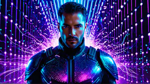Artistieke portretfoto in cyberpunk stijl met indrukwekkende neon lichteffecten in blauw en paars. Het futuristische kostuum met technologische details wordt versterkt door een spectaculaire achtergrond van lichtstralen en gloeiende patronen. perfect voor moderne mediaprojecten en sci-fi concepten.