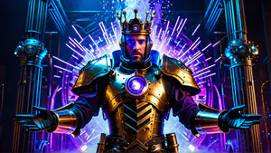Indrukwekkende compositie van een modern ridderharnas met gouden details en een verlichte kern, geplaatst tegen een achtergrond van neonblauwe en paarse lichteffecten. Het futuristische ontwerp combineert middeleeuwse elementen met cyberpunk-technologie, perfect voor gaming- en entertainment-projecten.