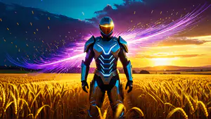 Spectaculaire compositie van een hightech robotharnas met neonblauwe accenten, staand in een goudgeel korenveld tijdens zonsondergang. Dramatische paarse lichteffecten en vonken creëren een surrealistisch contrast tussen natuurlijke en futuristische elementen. perfect voor gaming, technologie of science fiction concepten.