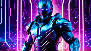 Indrukwekkende digitale kunstafbeelding van een geavanceerd robotharnas in metallic blauw, verlicht door neon accenten tegen een levendige paarse achtergrond. Het hypermoderne ontwerp combineert strakke lijnen met hoogwaardige technologie, perfect voor gaming- en sciencefiction-gerelateerde projecten of futuristische concepten.