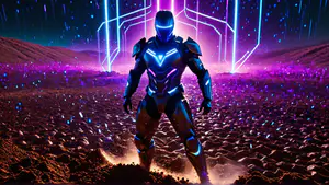 Imposante digitale illustratie van een geavanceerd robotharnas, geaccentueerd door strakke neonblauwe lichtlijnen tegen een paars verlichte sciencefiction achtergrond. Het futuristische pantser staat stevig op een rotsachtig terrein, omringd door zwevende lichtdeeltjes die een mysterieuze sfeer creëren. perfect voor gaming- en technologie-gerela...