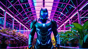 Indrukwekkende compositie van een high-tech robotharnas met blauwe LED-verlichting, geplaatst in een kas met paarse neonverlichting en weelderige tropische planten. De futuristische setting creëert een unieke cyberpunk sfeer waar technologie en natuur samenkomen in een surrealistisch tafereel.