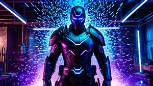 Imposant robotharnas in cyberpunk-stijl, verlicht door neonblauwe en paarse accenten tegen een achtergrond van sprankelende lichteffecten. Het futuristische ontwerp combineert strakke lijnen met geavanceerde technologie, perfect voor gaming- en sciencefiction-projecten. De dramatische belichting creëert een meeslepende sfeer.