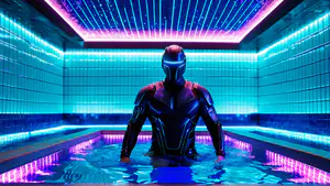 Spectaculaire futuristische scène van een hightech robotpak in een zwembad, omgeven door intense neonblauwe en paarse verlichting. Het water reflecteert de geavanceerde LED-verlichting en creëert een meeslepende cyberpunk atmosfeer. perfect voor gaming, technologie of toekomstgerichte projecten die een moderne uitstraling willen uitdragen.