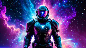 Spectaculaire digitale kunst van een high-tech ruimtepak met gloeiende accenten tegen een levendige kosmische achtergrond. De nevel explodeert in neon blauwe en paarse tinten, bezaaid met heldere sterren. Het moderne pantser straalt kracht en technologische vooruitgang uit, perfect voor gaming of sci-fi concepten.