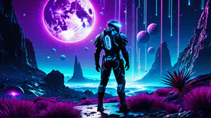 Spectaculaire sciencefiction illustratie van een astronaut in een geavanceerd ruimtepak, staand in een surrealistisch landschap met neonkleuren. De scène wordt gedomineerd door een gigantische paarse maan, vallende lichtstralen en exotische vegetatie in levendige neonkleuren. perfect voor gaming, boekomslagen of futuristische projecten.