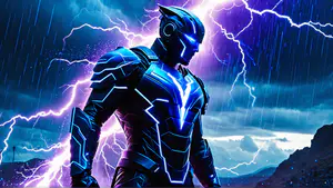 Spectaculaire digitale illustratie van een futuristische krijger in een geavanceerd harnas met neonblauwe accenten. Tegen een dramatische achtergrond met bliksemschichten en donkere wolken straalt het harnas een mysterieuze energie uit. perfect voor gaming-gerelateerde projecten of moderne sci-fi ontwerpen.