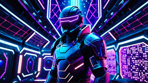 Indrukwekkende digitale illustratie van een gepantserde figuur in een hypermoderne omgeving, badend in neonblauw en paars licht. De gedetailleerde high-tech uitrusting en de futuristische achtergrond met lichtgevende lijnen creëren een meeslepende cyberpunk sfeer die perfect aansluit bij moderne gaming en sci-fi concepten.