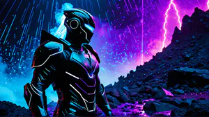 Spectaculaire digitale illustratie van een futuristische krijger in zwart gepantserd pak met neon accenten, staand in een mysterieus berglandschap. De dramatische achtergrond wordt verlicht door elektrische bliksemschichten en een kleurrijk neonspectrum van blauw en paars, wat zorgt voor een meeslepende cyberpunk sfeer.