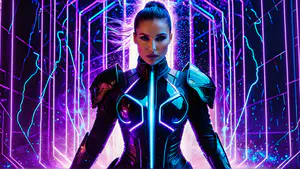 Indrukwekkende digitale kunstafbeelding van een futuristische krijger in een high-tech pantser, omgeven door levendige neonkleuren en energetische lichteffecten. Het ontwerp combineert cyberpunk-elementen met moderne sci-fi esthetiek, perfect voor gaming artwork of digitale media projecten. De paarse en blauwe tinten creëren een meeslepende atmo...
