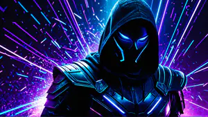 Imposante digitale illustratie van een mysterieuze krijger in futuristisch harnas, gehuld in een donkere mantel met capuchon. Het beeld wordt gedomineerd door levendige neonkleuren in blauw en paars, met dramatische lichteffecten die een explosieve energie uitstralen. perfect voor gaming artwork of moderne wanddecoratie.