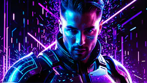 Sfeervolle cyberpunk compositie met dramatische neonverlichting in blauw en paars. De futuristische uitstraling wordt versterkt door digitale effecten, holografische details en een high-tech harnas. perfect voor gaming artwork, albumcovers of moderne marketingcampagnes die een vooruitstrevende technologische sfeer willen uitstralen.
