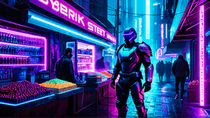 Sfeervolle cyberpunk straatscène met een imposante robot in zwart harnas, verlicht door paarse en blauwe neonreclames. De nachtelijke winkelstraat straalt een futuristische sfeer uit met verlichte etalages en marktkramen. perfect voor gaming, sci-fi projecten of moderne marketingcampagnes met een technologisch tintje.