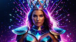 Betoverende digitale kunstcompositie in cyberpunk-stijl met intense neonkleuren. Het beeld toont een majestueuze verschijning met een kristallen kroon tegen een achtergrond van paarse en blauwe lichtstralen. Het futuristische kostuum met reflecterende elementen creëert een meeslepende gaming-sfeer.